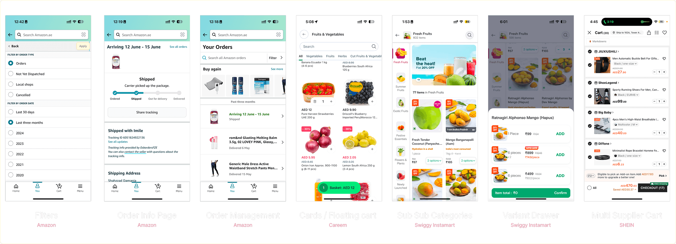 References included Amazon, Careem, Carrefour, Swiggy Instamart, Tabby and SHEIN — not to mimic UI, but to extract patterns of behaviour, interaction, and expectation.