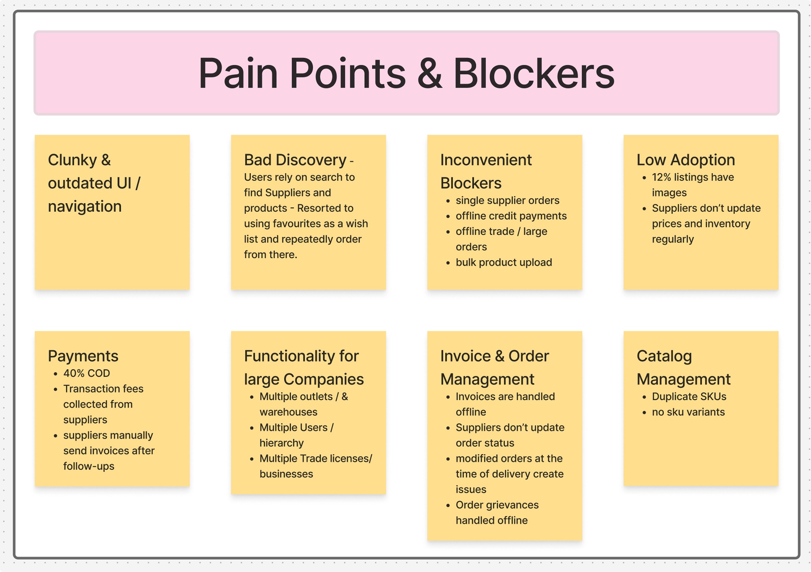 Through user interviews, operational audits, and live order shadowing, we uncovered a pattern: most high-value workflows were happening outside the app. Orders, payments, invoices, and credit were all being managed manually — turning the platform into an incomplete catalogue, not a system.